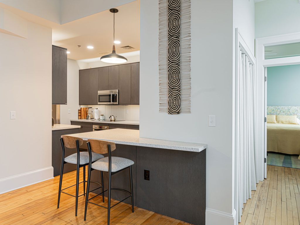The kitchen, which was not easily navigable and had wasted space, was redesigned. To accommodate a sit-at-bar and flat peninsula, we opened up the entry wall. We also opened the coat closet and relocated the electrical service panel to the other side, maximizing the use of the kitchen’s design.Â