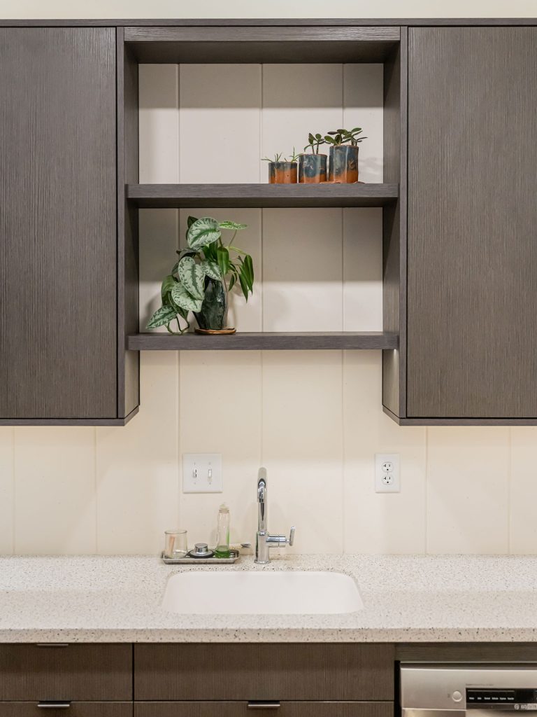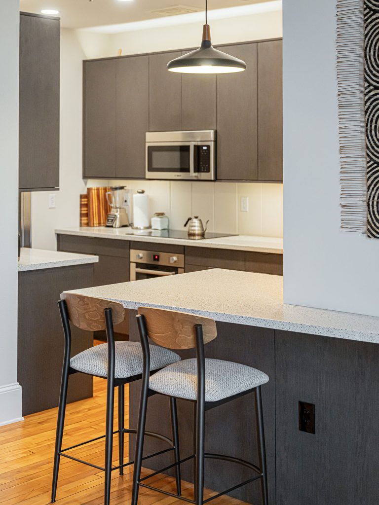 Corian countertops, an integrated sink, and custom grooved backsplash help keep the kitchen areas easy to clean. We added upper and lower cabinet lighting for ambiance and ease of use, and the new appliances, along with a living room bar extension, help round out the newly renovated space.