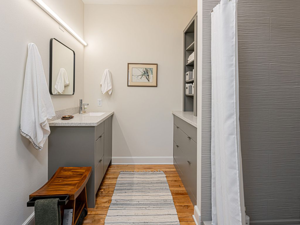On the inside, we remodeled both bathrooms one at a time to facilitate a live-in renovation. New cabinetry serves both functional and storage purposes. It allows the primary bathroom to have a more accessible flow, along with grab bars, a low-entry point shower with a textured pan to ensure safety, and solid surface panels for easy maintenance. Toto toilets with washlets are a mainstay in this remodel, as are the Corian countertops with integrated sinks.