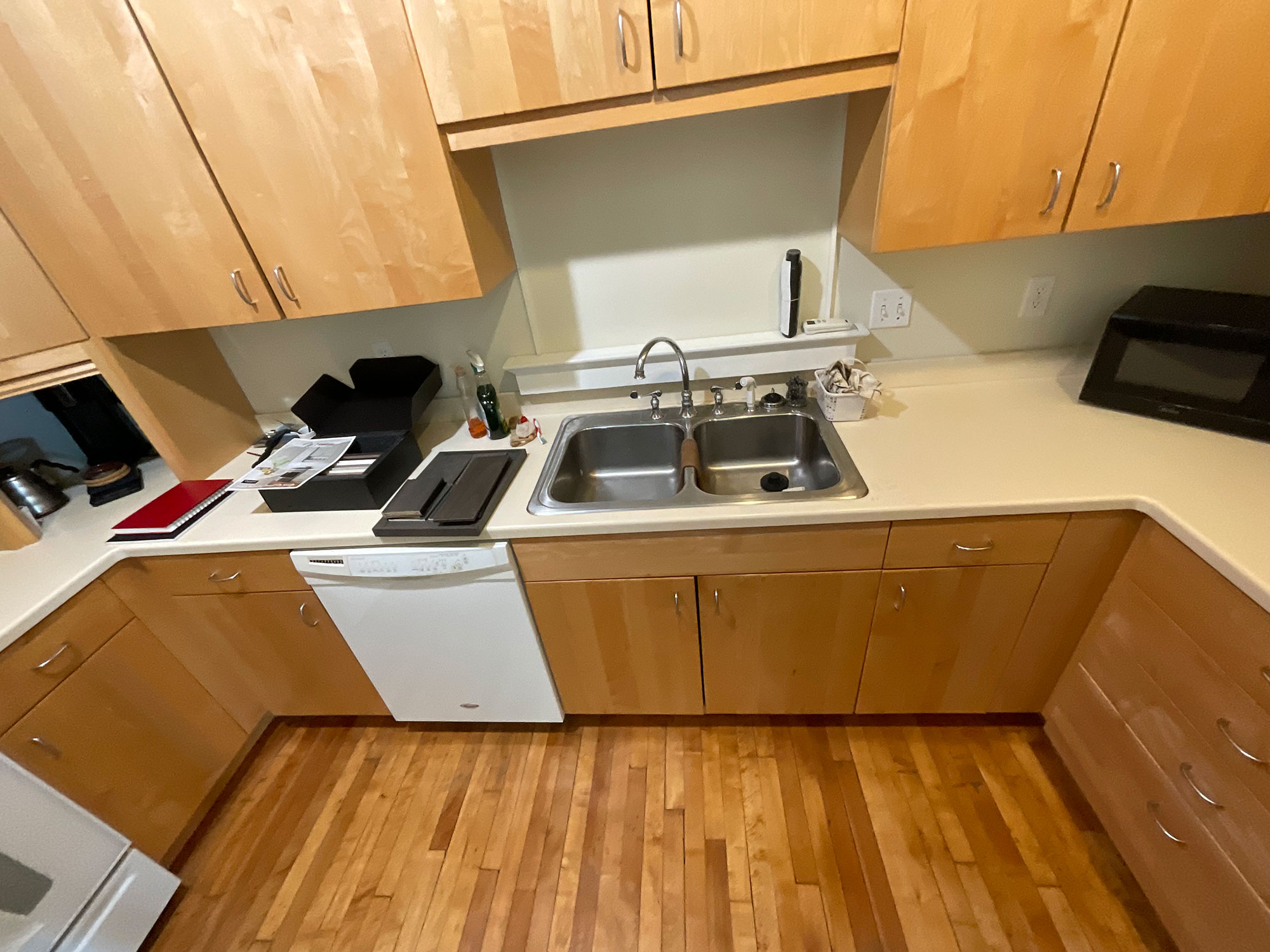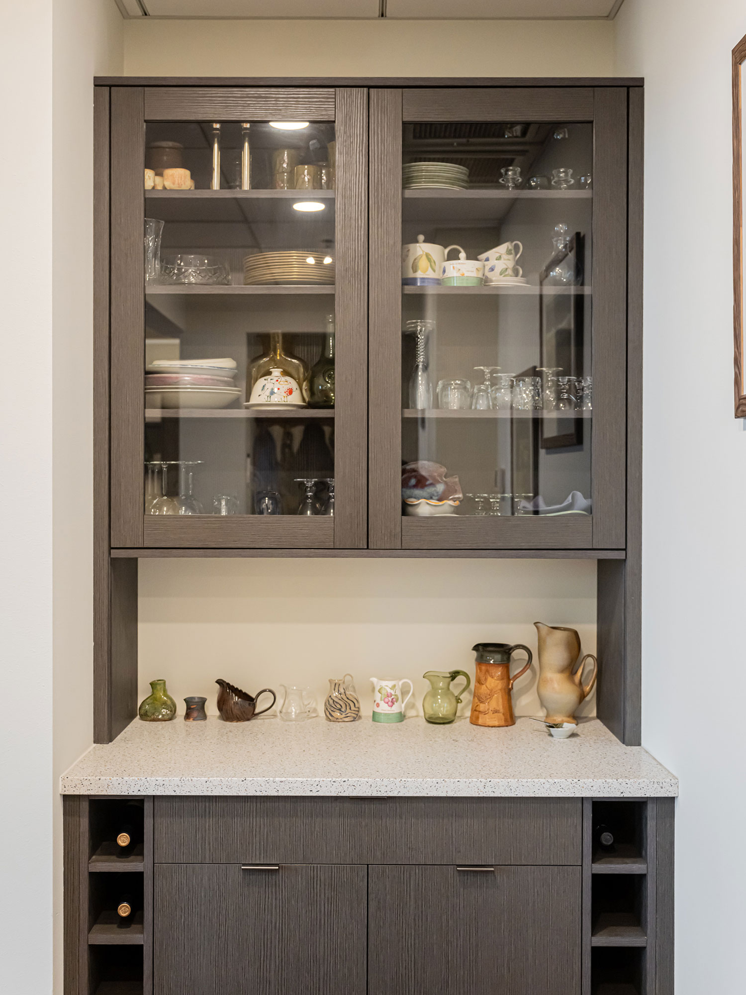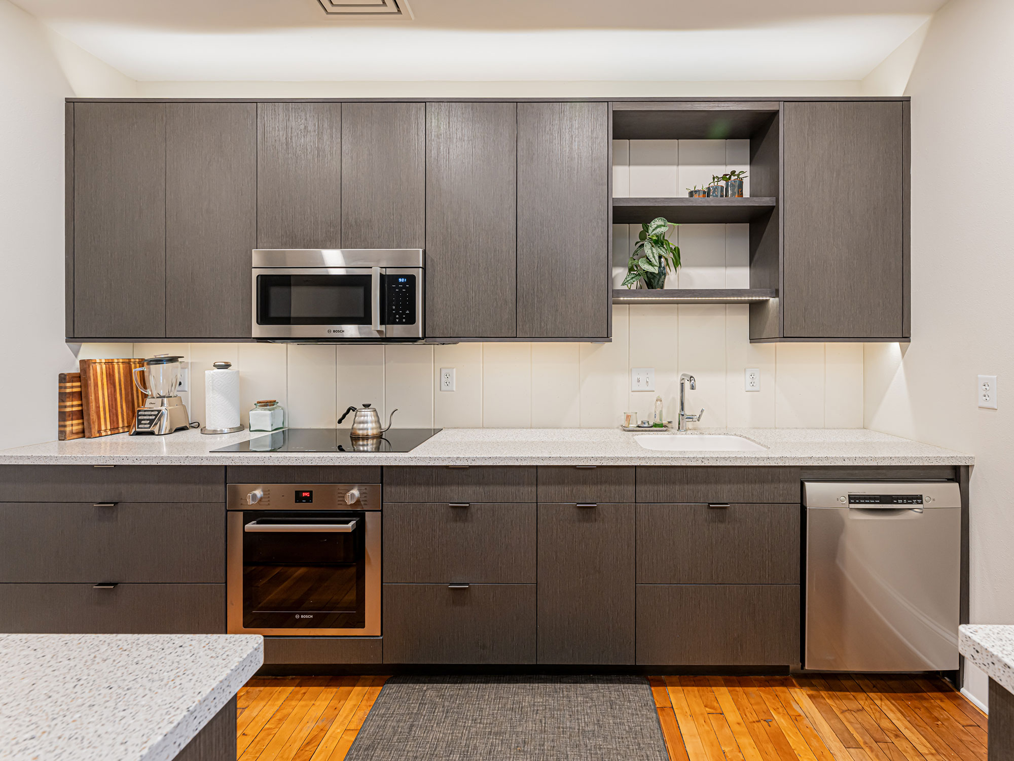 Corian countertops, an integrated sink, and custom grooved backsplash help keep the kitchen areas easy to clean. We added upper and lower cabinet lighting for ambiance and ease of use, and the new appliances, along with a living room bar extension, help round out the newly renovated space.