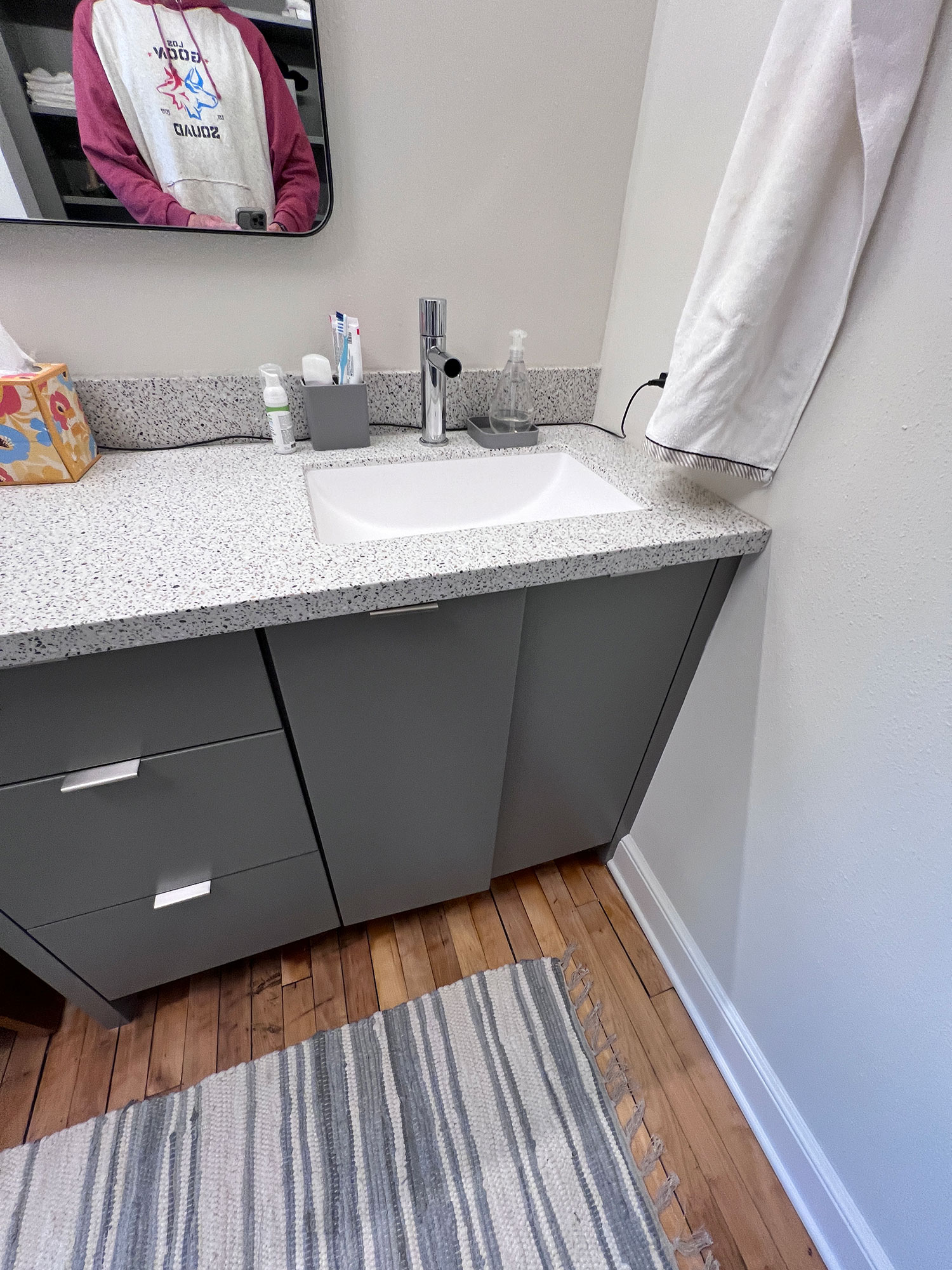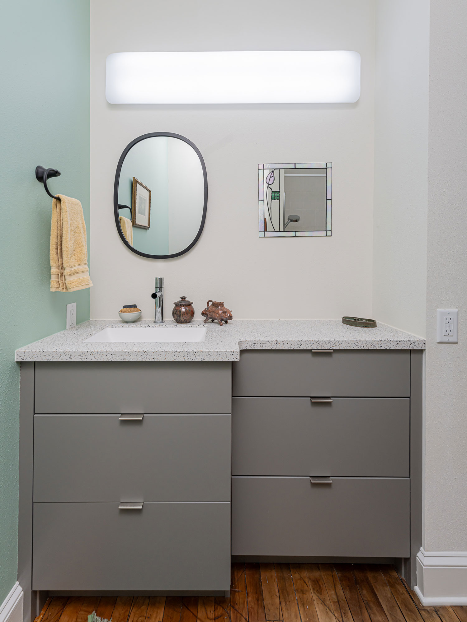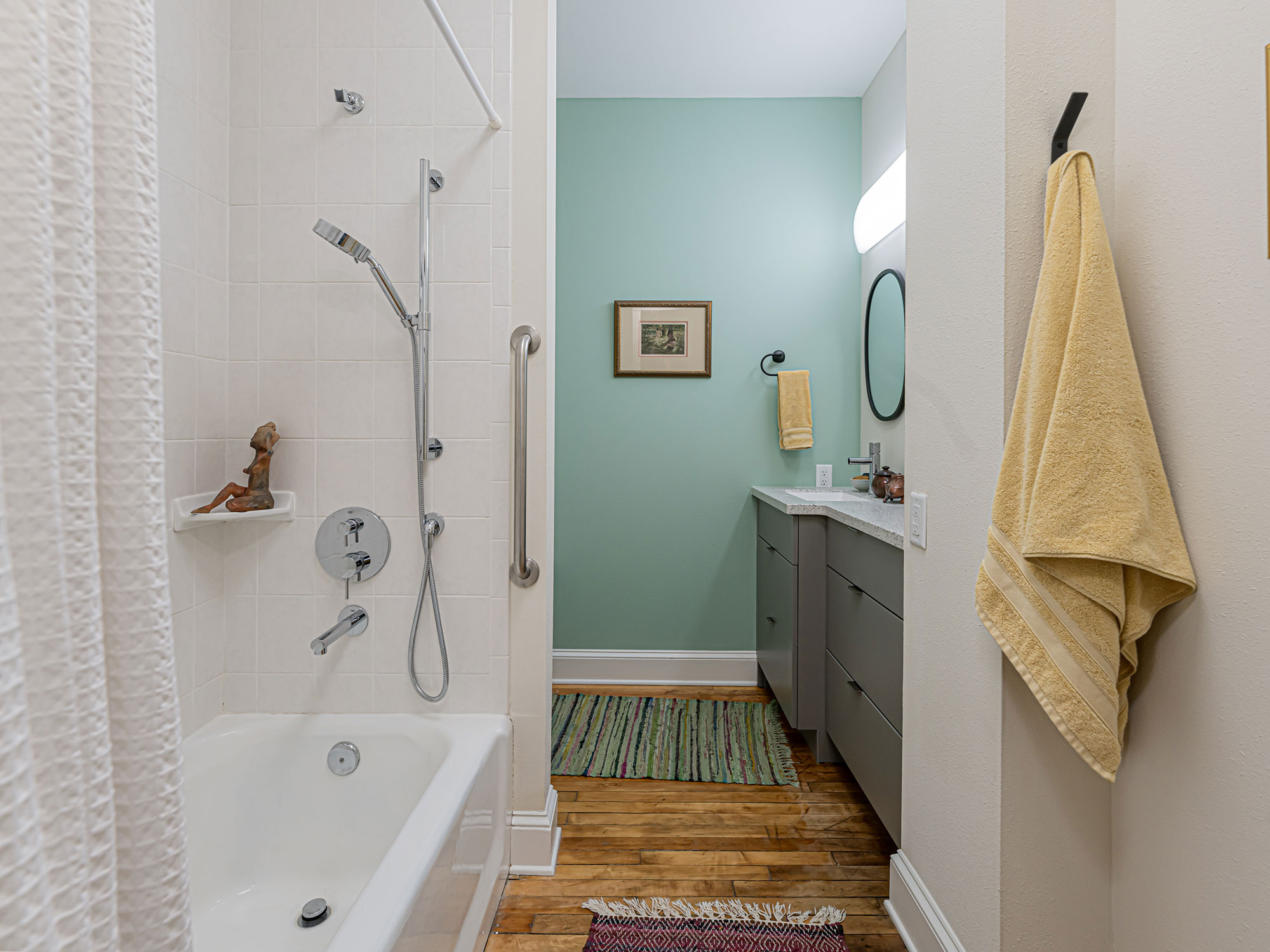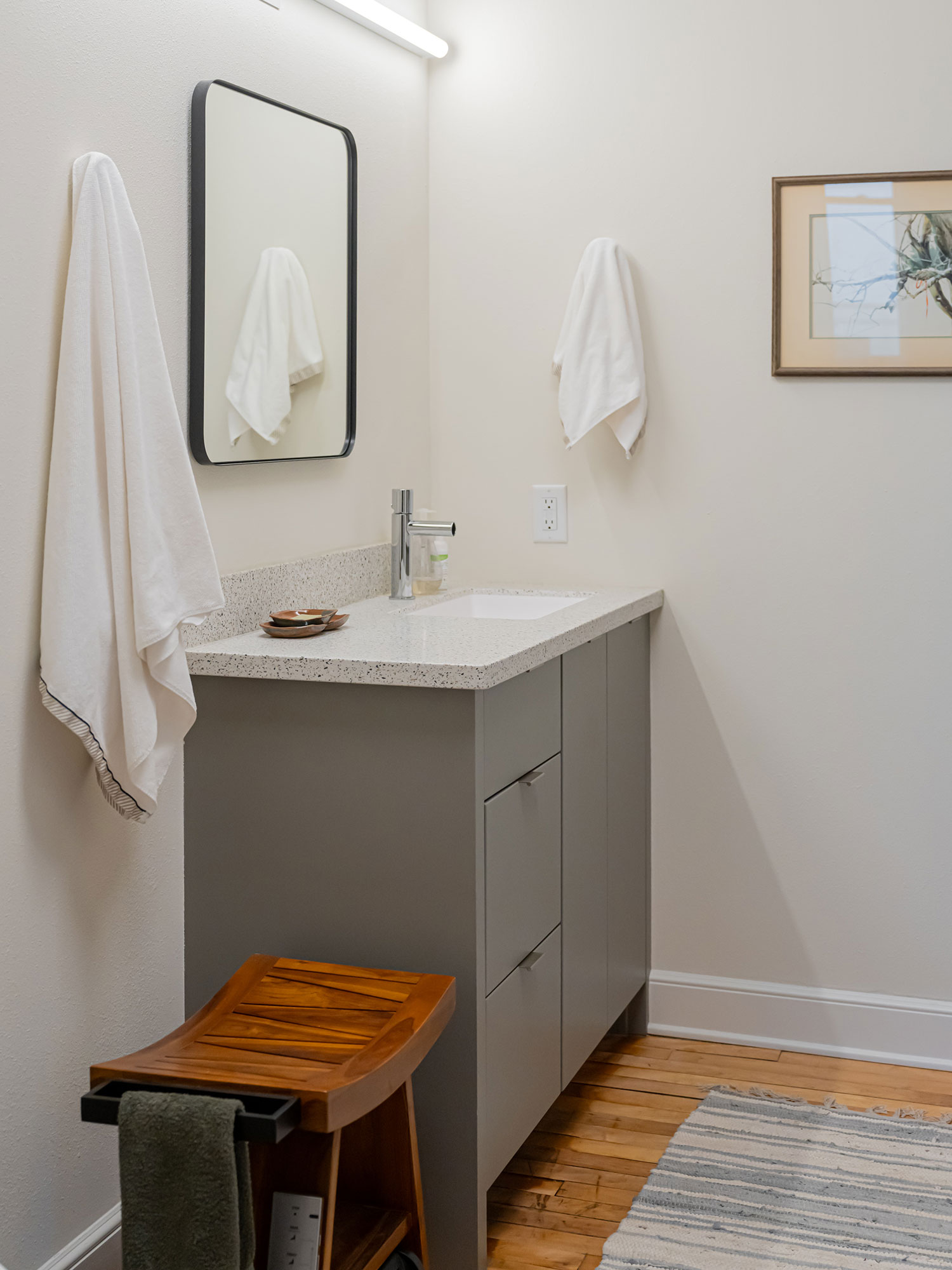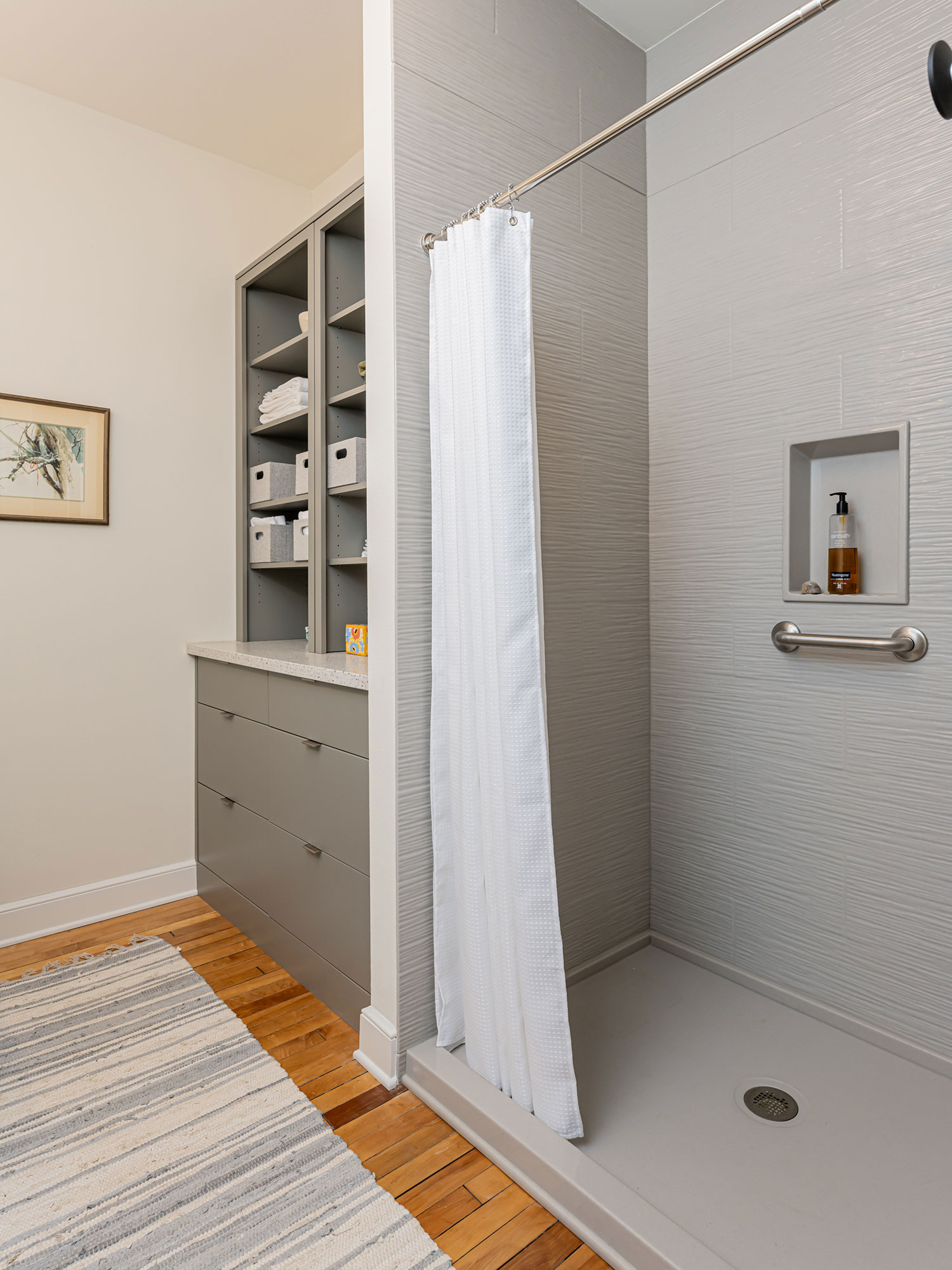 We opened the guest bathroom walls and gained additional space next to concrete support columns that helped us increase the entry clearance and maneuverability. The cabinetry was custom-built to help achieve greater clearances, and the tub remained with grab bars installed and all new fixtures for accessibility.