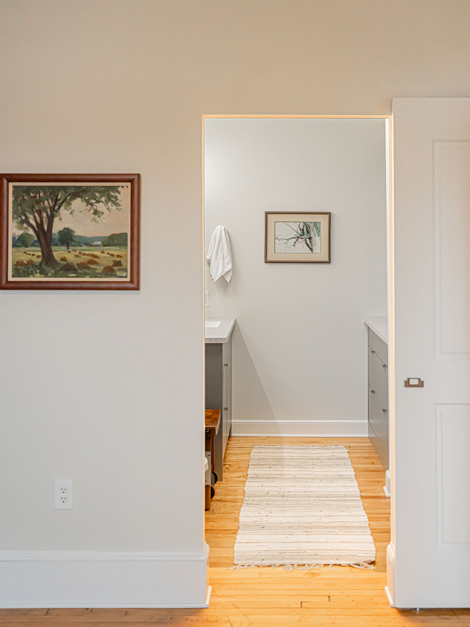 On the inside, we remodeled both bathrooms one at a time to facilitate a live-in renovation. New cabinetry serves both functional and storage purposes. It allows the primary bathroom to have a more accessible flow, along with grab bars, a low-entry point shower with a textured pan to ensure safety, and solid surface panels for easy maintenance. Toto toilets with washlets are a mainstay in this remodel, as are the Corian countertops with integrated sinks.