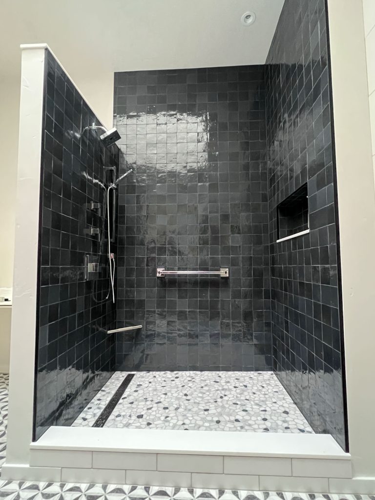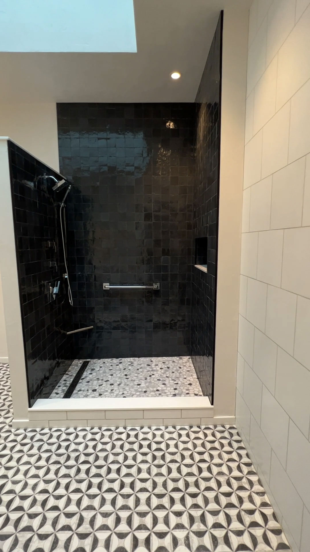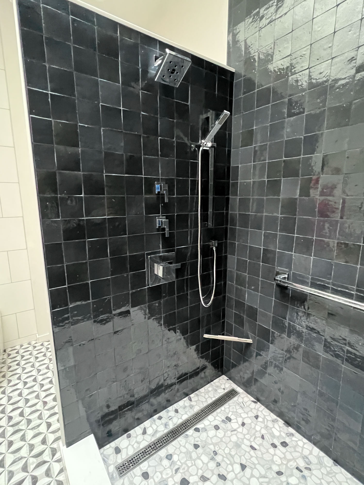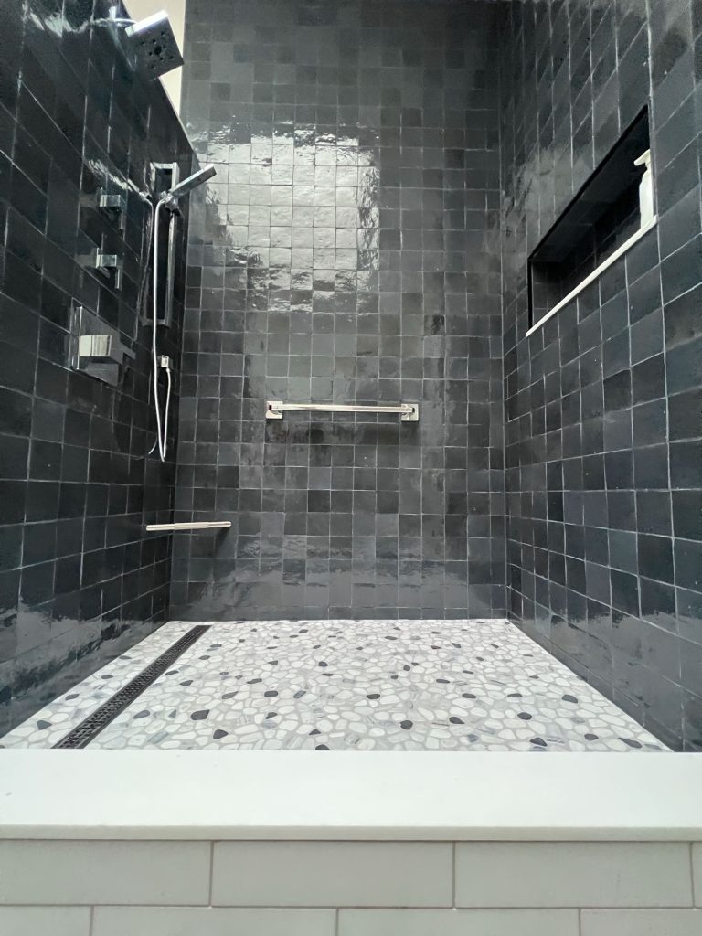 The shower was finished with Clé Tile Zellige tile and a pebble floor. The product specs will be below in full detail. The alcove was finished with faux Venetian plaster to match the rest of the condo. The bathroom would receive new marble floor tile that would bring color into the bathroom. Black grid glass would finish off the design along with chrome fixtures.