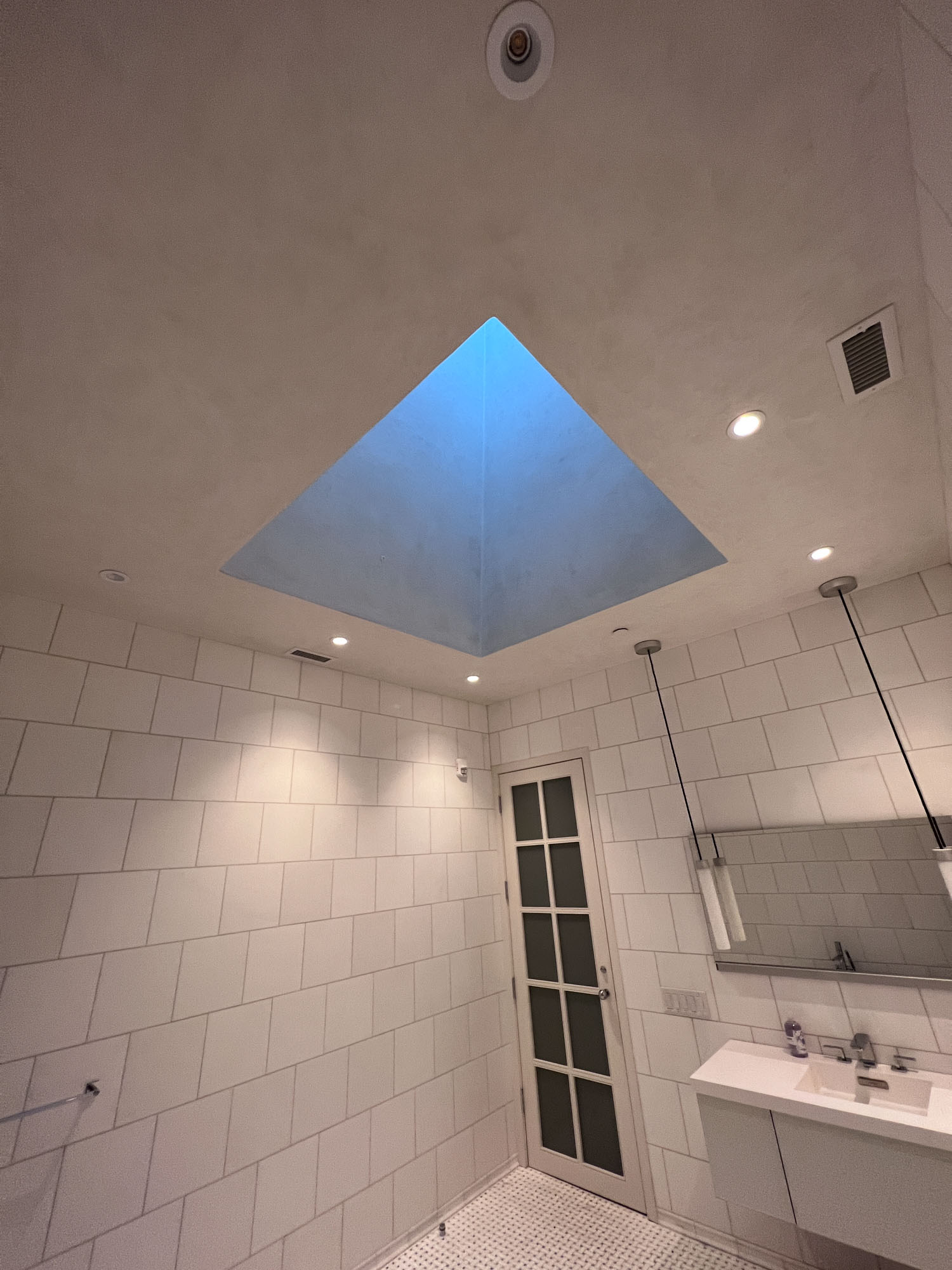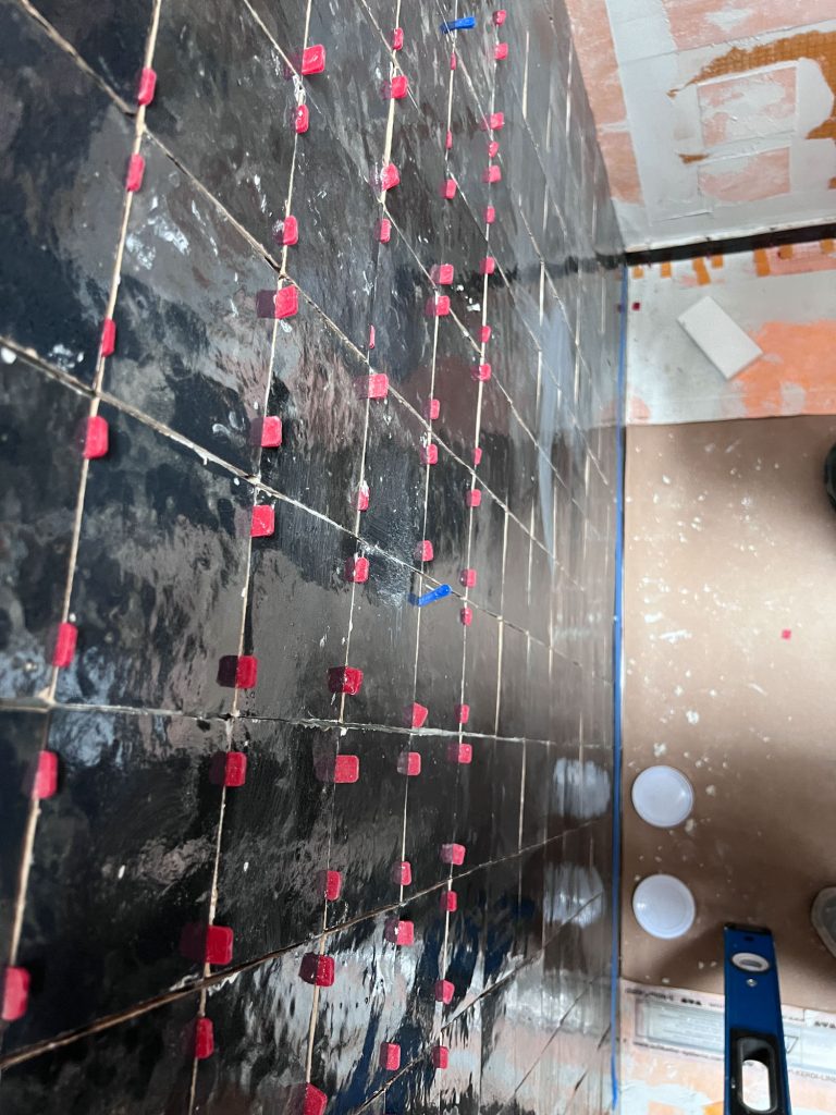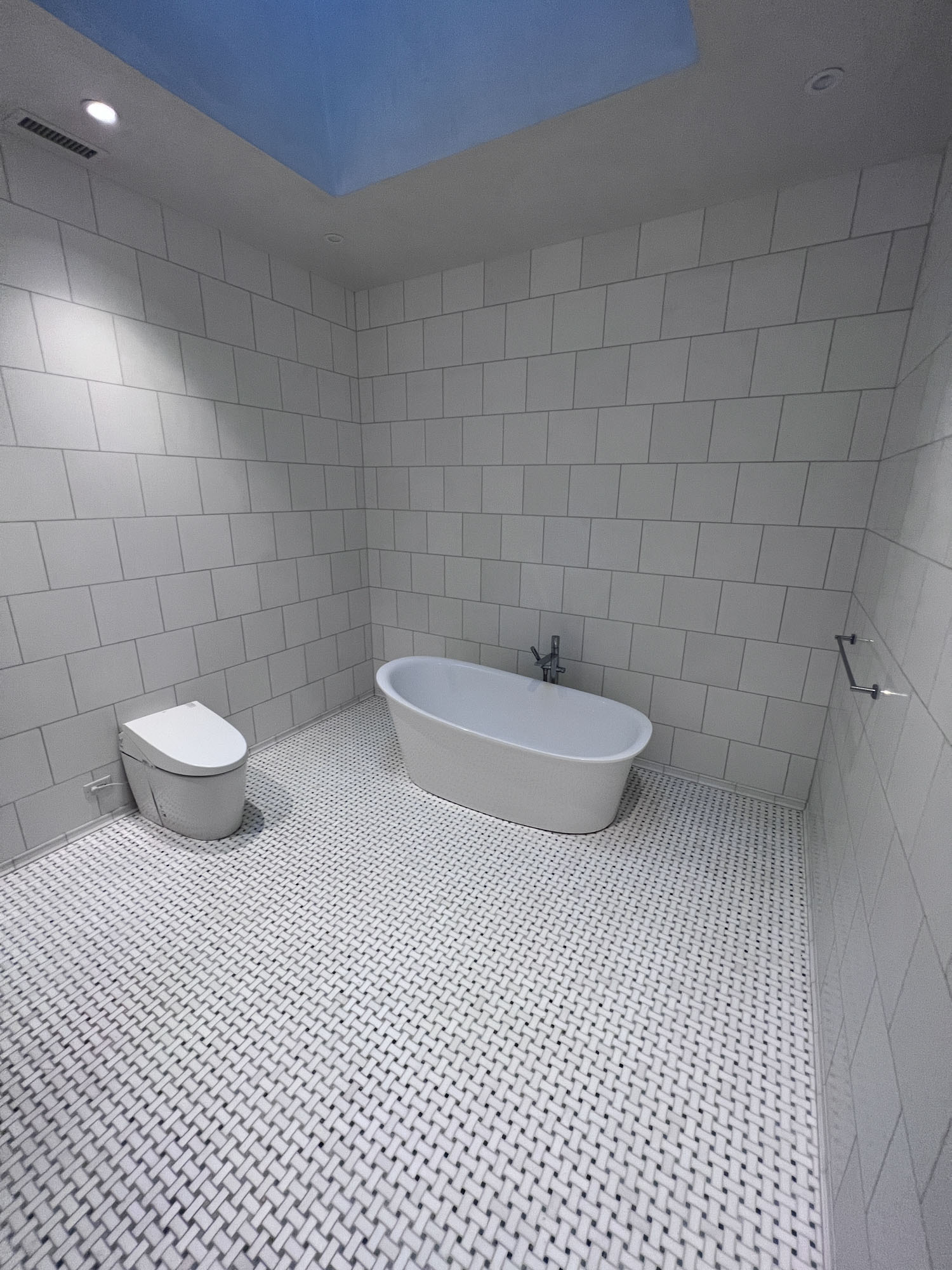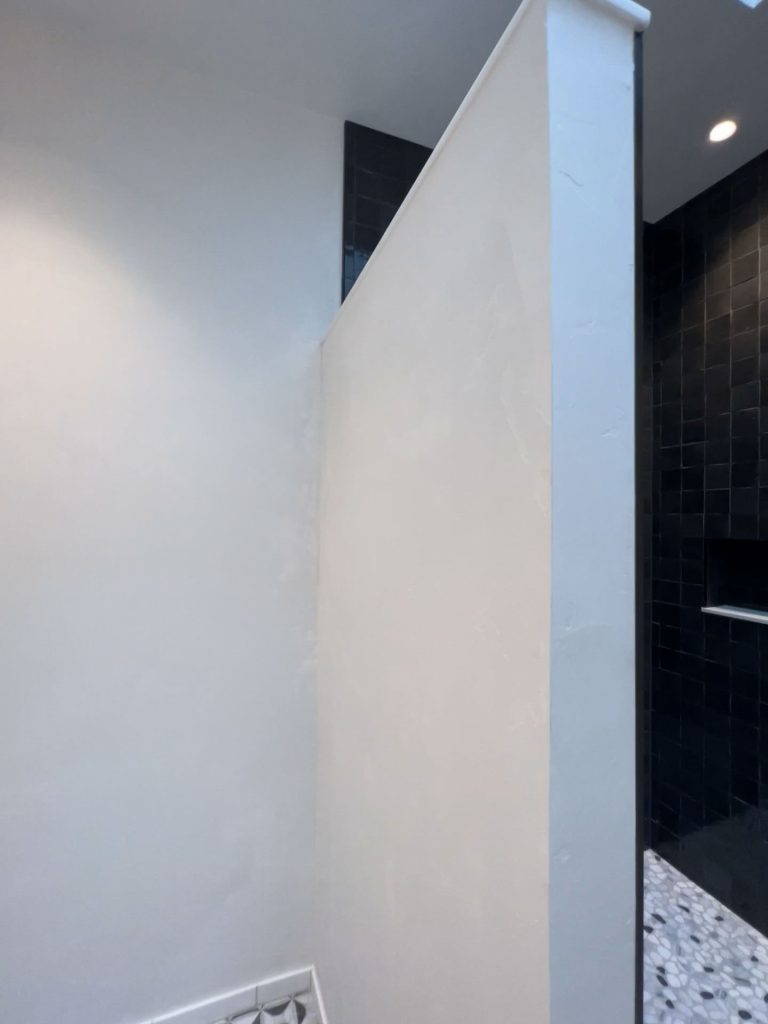 The shower was finished with Clé Tile Zellige tile and a pebble floor. The product specs will be below in full detail. The alcove was finished with faux Venetian plaster to match the rest of the condo. The bathroom would receive new marble floor tile that would bring color into the bathroom. Black grid glass would finish off the design along with chrome fixtures.