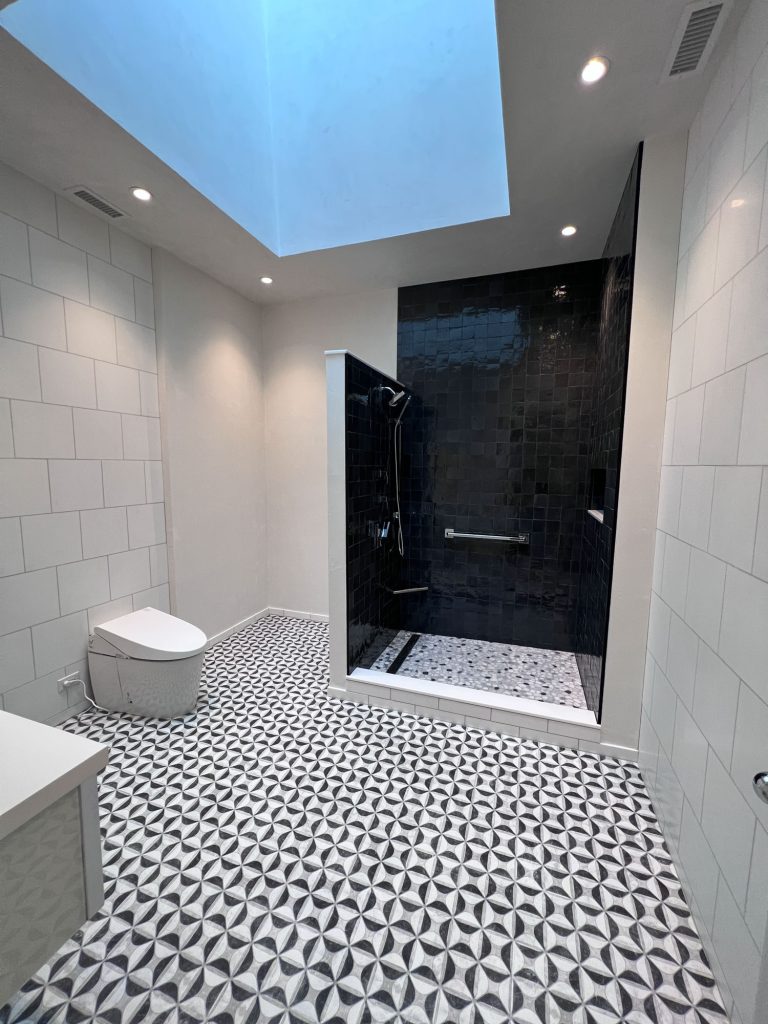 The master bathroom did not have a shower, and the new owners would only purchase it if we could install one. So, we consulted with their designer before the purchase. Due to some framing issues, we couldn’t change the toilet’s footprint.