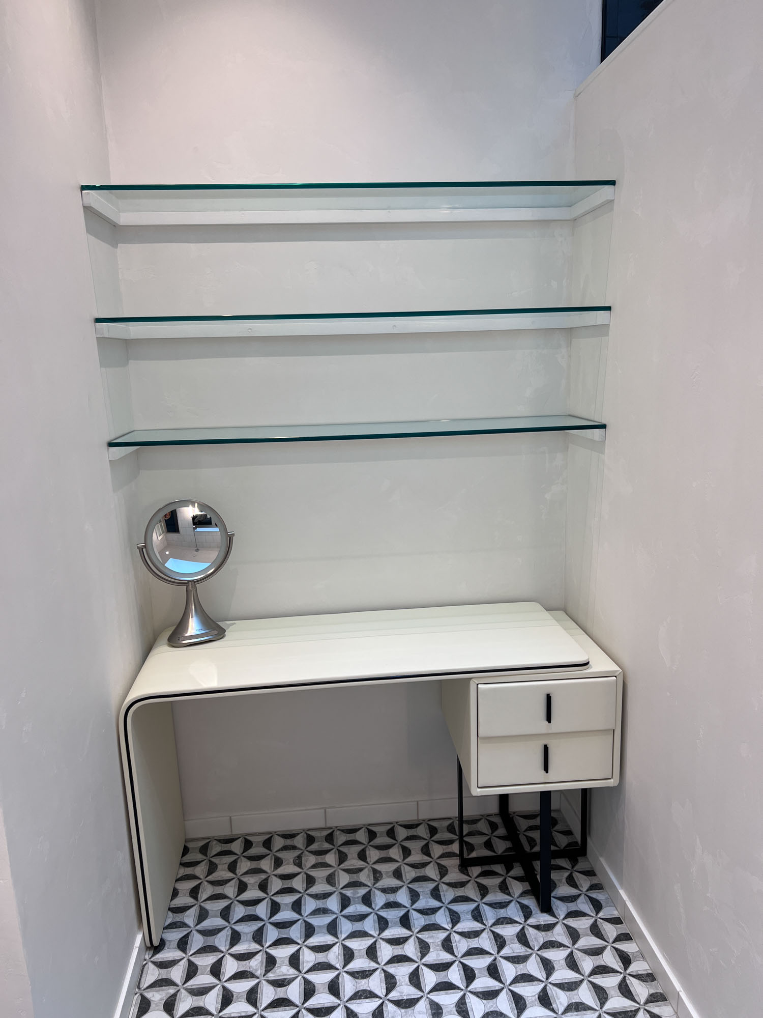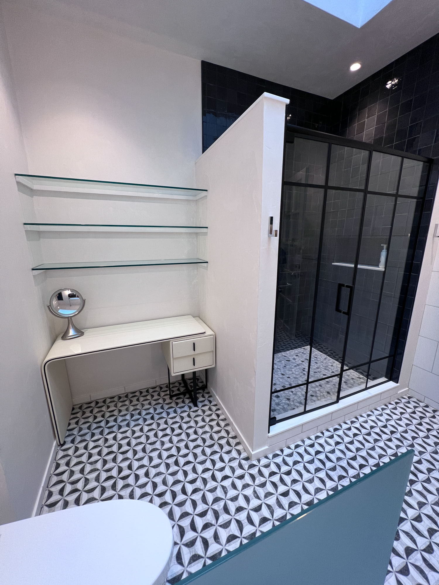 So we removed the floor, rear wall tile and framed in a new shower that also created a makeup alcove.