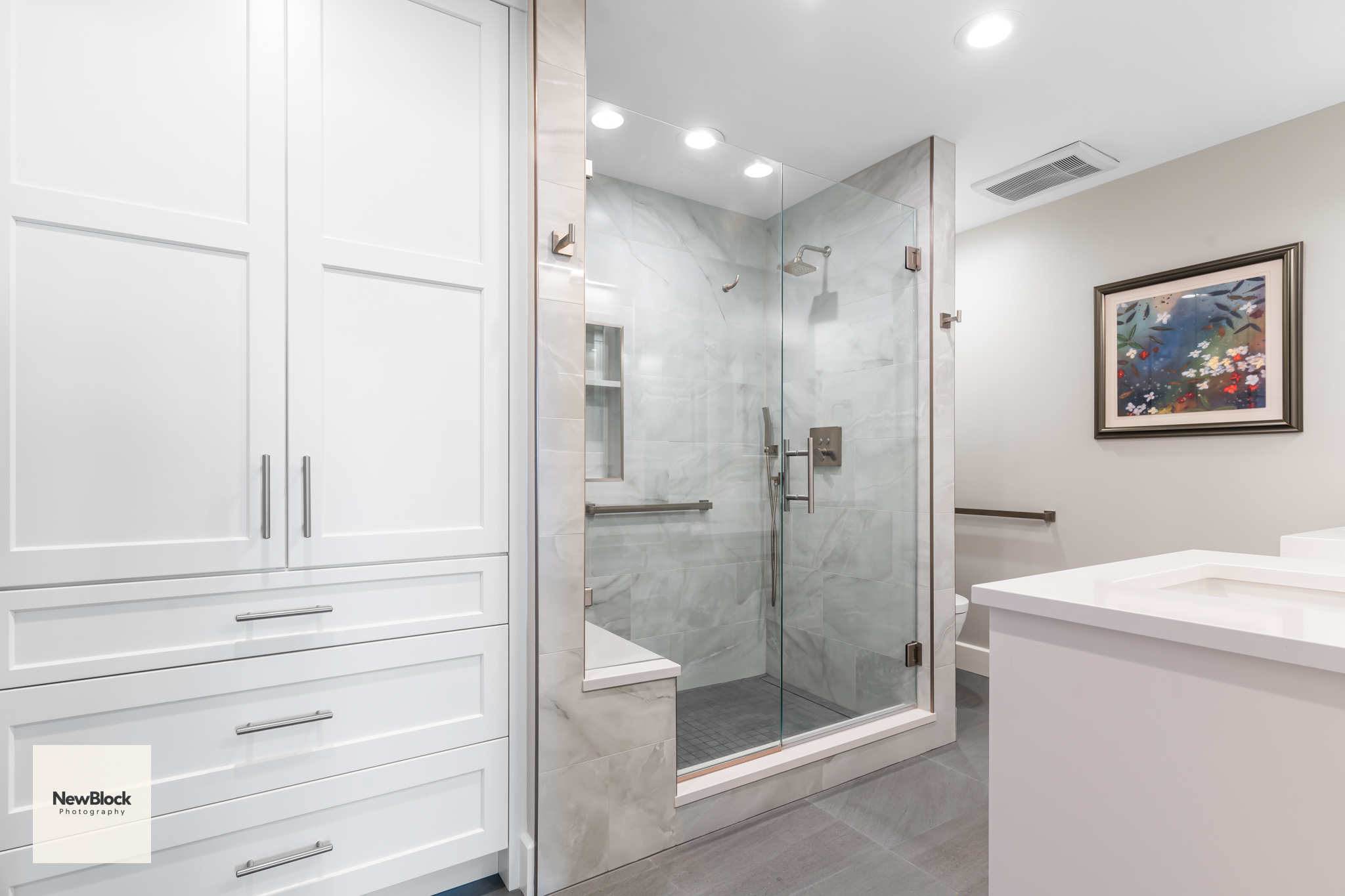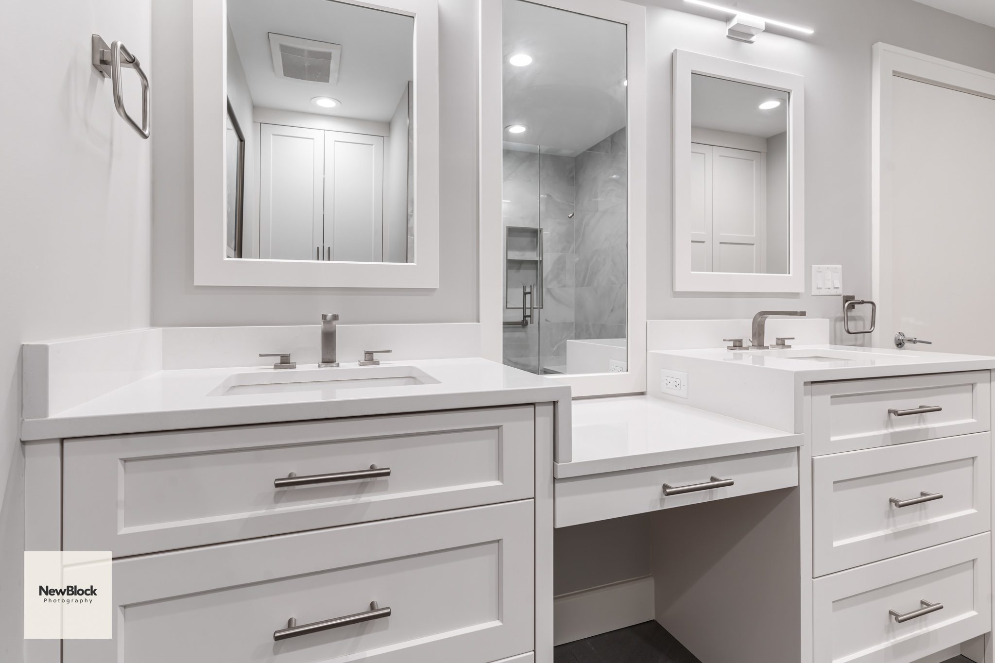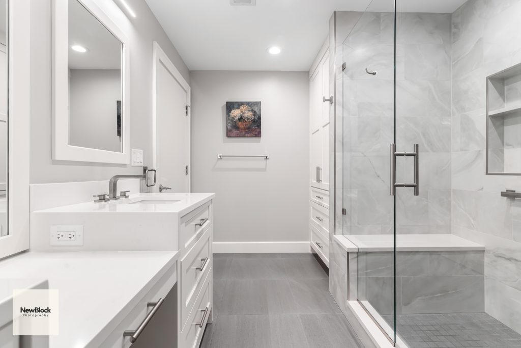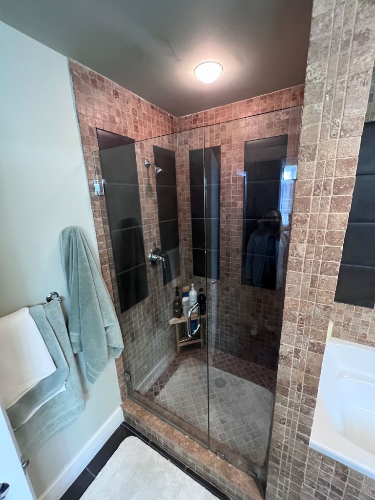 Some really like brown tile, some need a shower and a tub. They did not, and wanted more storage and a beautiful shower. Having a makeup vanity had always been a dream of theirs. Together, we transformed their primary bathroom into an elegant and functional space.